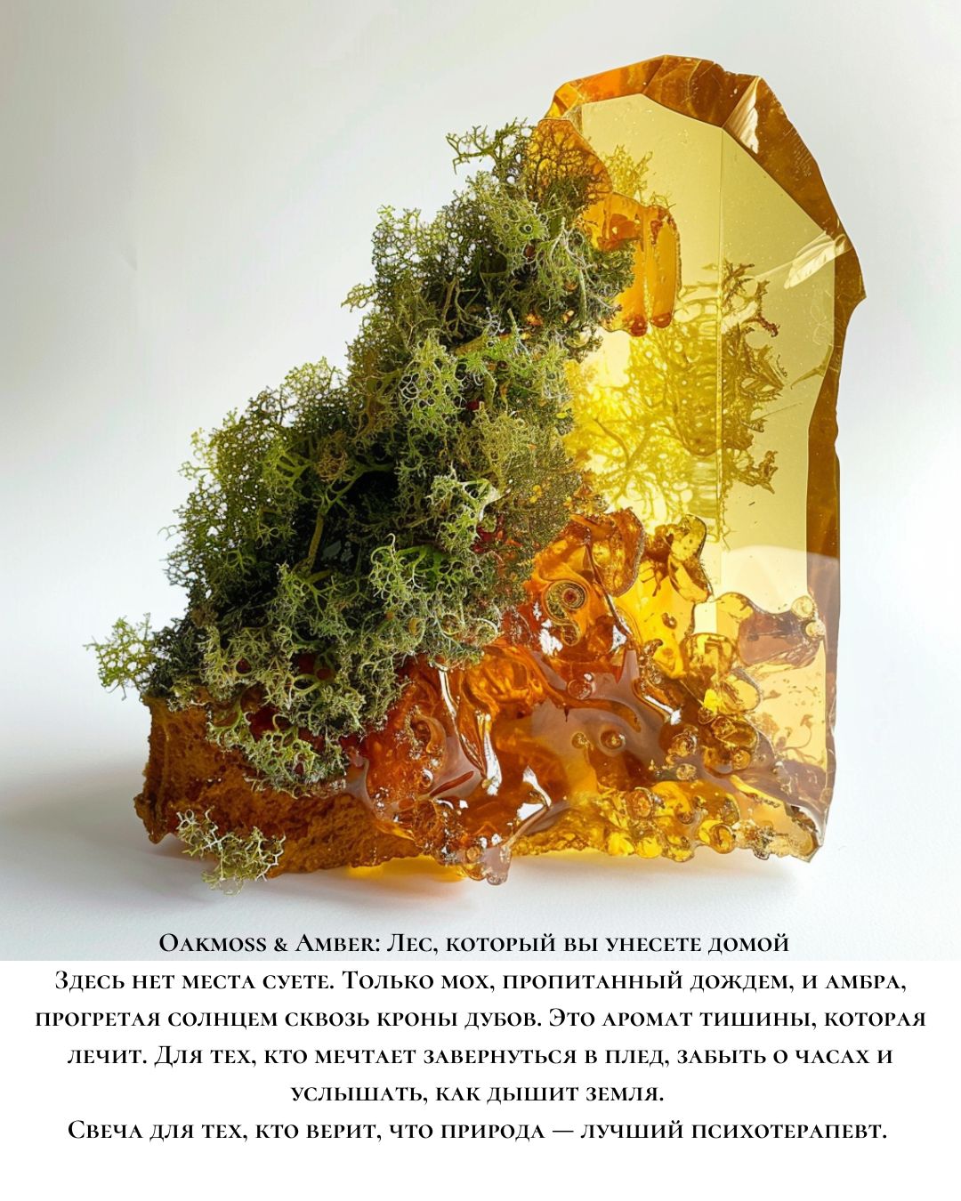 Здесь нет места суете. Только мох, пропитанный дождем, и амбра, прогретая солнцем сквозь кроны дубов. Это аромат тишины, которая лечит. Для тех, кто мечтает завернуться в плед, забыть о часах и услышать, как дышит земля. Свеча для тех, кто верит, что природа — лучший психотерапевт.