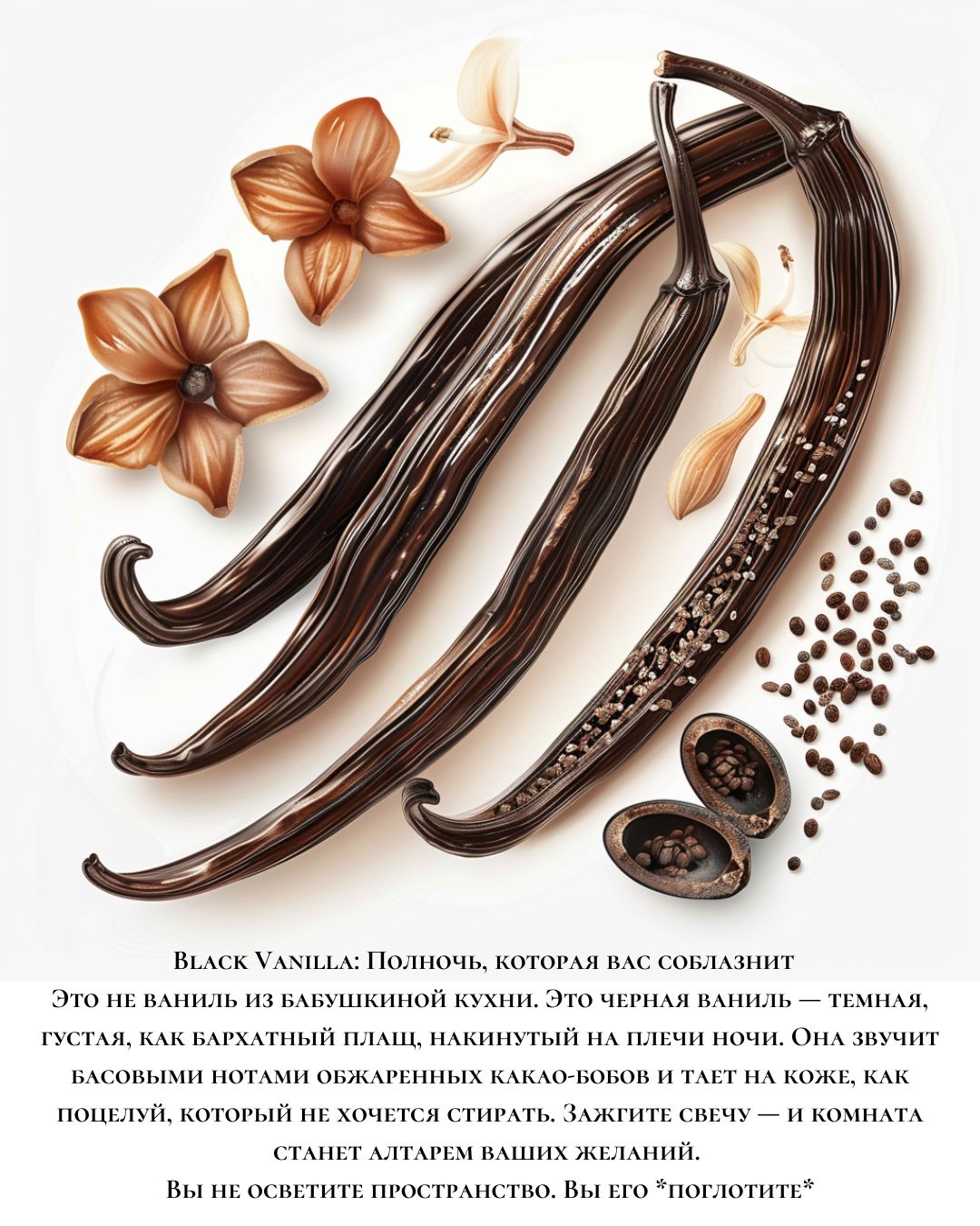 Это не ваниль из бабушкиной кухни. Это черная ваниль — темная, густая, как бархатный плащ, накинутый на плечи ночи. Она звучит басовыми нотами обжаренных какао-бобов и тает на коже, как поцелуй, который не хочется стирать. Зажгите свечу — и комната станет алтарем ваших желаний. Вы не осветите пространство. Вы его *поглотите*.