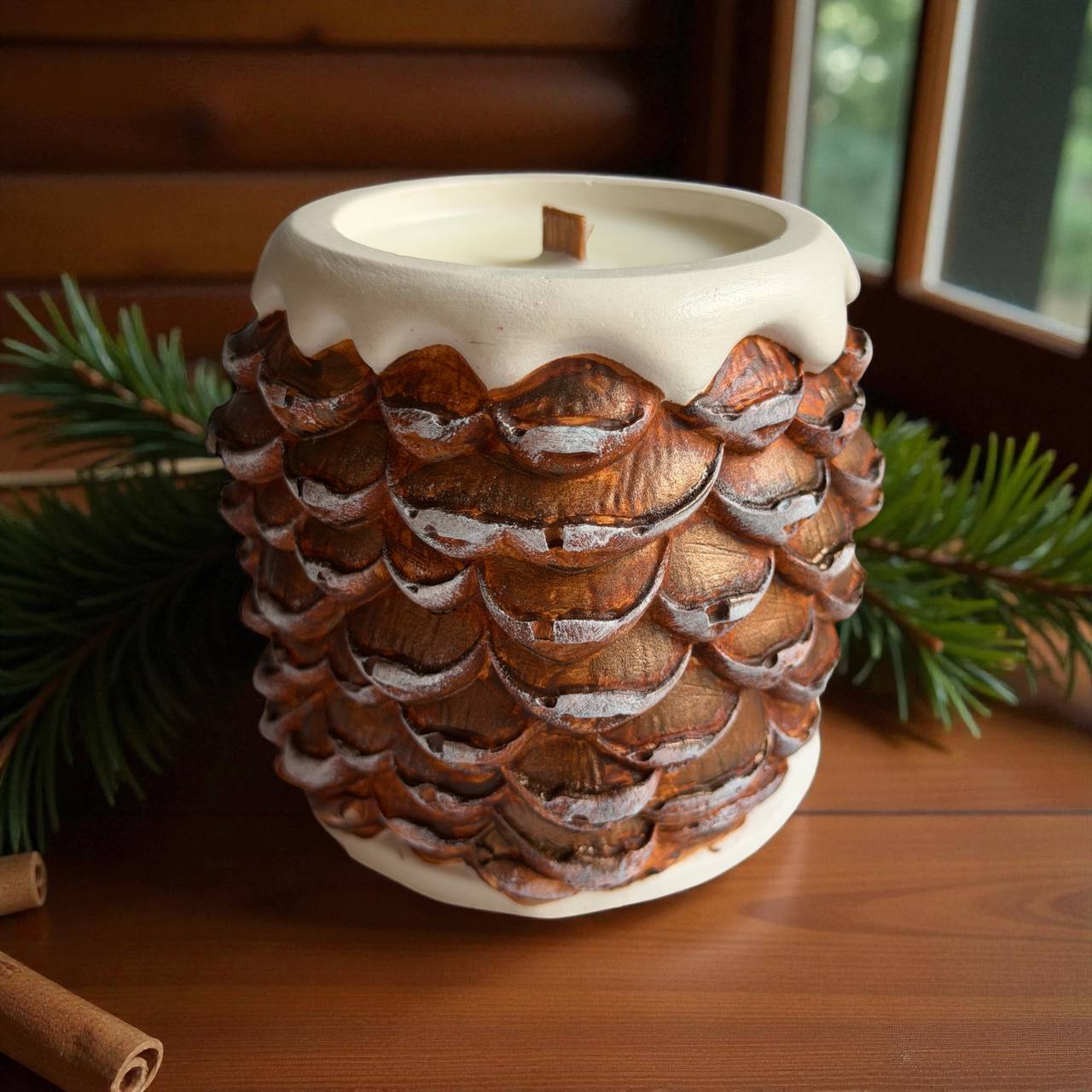 Внутри — соевый воск и деревянный фитиль, который потрескивает, как крошечный камин.