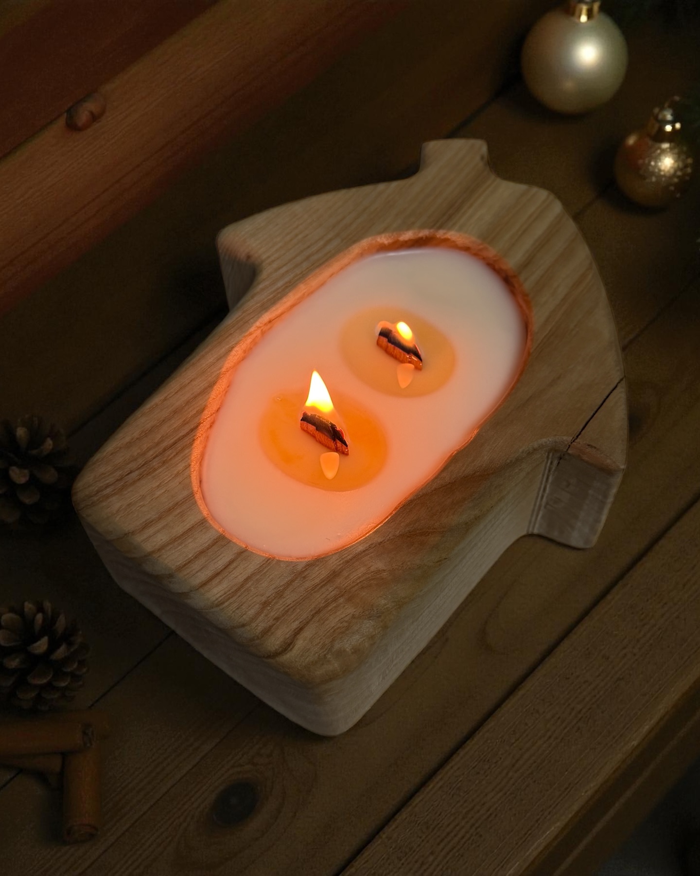 Внутри — натуральный соевый воск, два поющих деревянных фитиля и аромат, который вы выберете из зимней коллекции