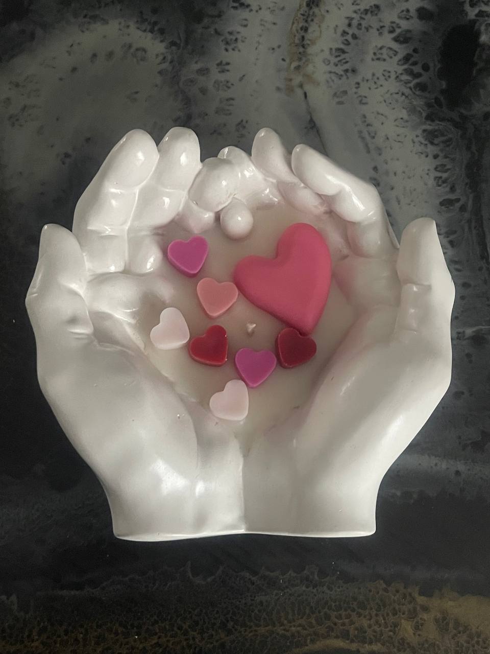 Каждая свеча создана вручную: гипсовый подсвечник в форме ласковых ладоней будто бережно держит тепло для вас. Натуральный соевый воск не только безопасен, но и дарит ровное, чистое горение. А милые восковые сердечки внутри тают, превращаясь в живой огонь, символизирующий любовь.